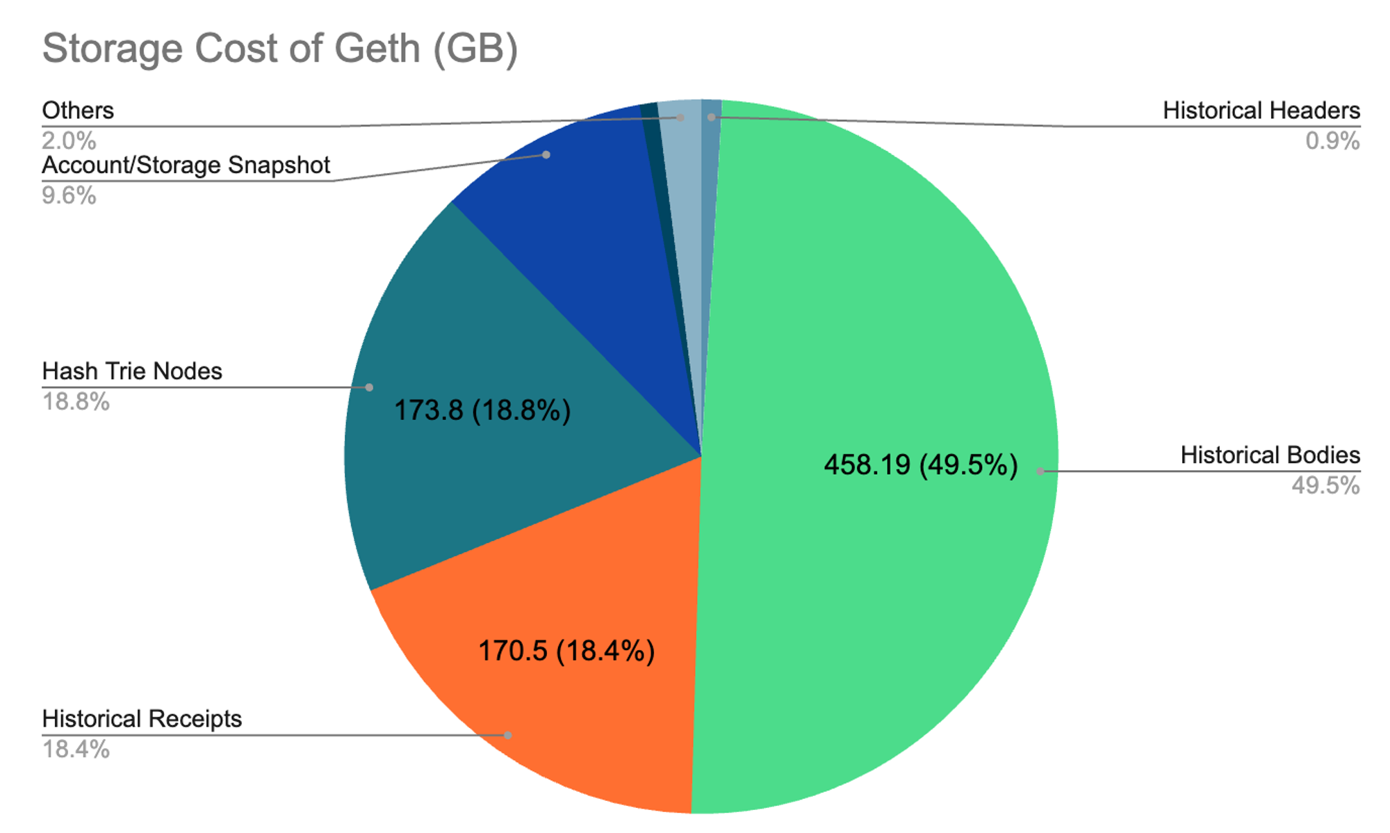 The first reason stems from the escalating storage demands of running an Ethereum client. To delve into the specific requirements, the following pie chart illustrates the distribution of storage costs for a fresh Geth node, as of block 18,779,761 on December 13, 2023.
