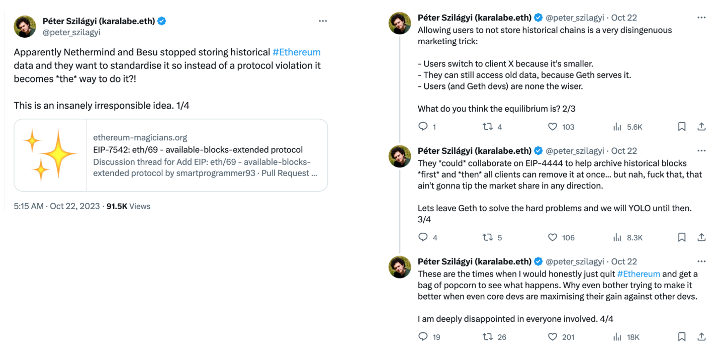 On Oct 22, 2023, Péter Szilágyi, the renowned Go-Ethereum (Geth) dev lead, expressed his deep concerns on Twitter. He pointed out that while Geth clients preserve all historical data, other Ethereum clients like Nethermind and Besu can be configured to operate without certain historical Ethereum data, such as historical block bodies and headers. This makes all clients inconsistent and is unfair to Geth. It sparked intense discussions and debates surrounding the Ethereum Storage problem within the Ethereum roadmap.